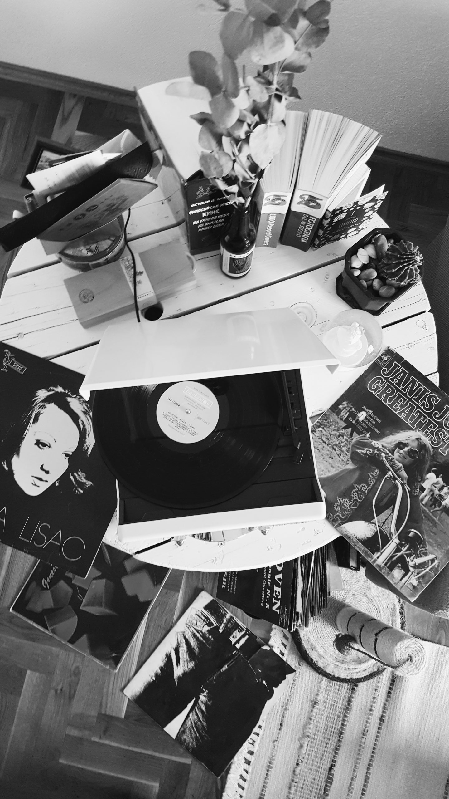 Sad već dolazimo i do drugog dijela posta, posvećenog drugom krivcu za moje intenzivnije slušanje muzike, koji nam je relativno nedavno stigao — gramofonu. Ja nisam neki zaluđenik kad je riječ o pločama i gramofonima i nemam neke visoke (čitaj: gotovo nikakve) kriterijume kad je riječ o kvalitetu zvuka, bitno mi je da se muzika čuje. Ali samo to iskustvo biranja ploče koja će se slušati, njenog stavljanja, onog specifičnog pucketanja, stvarno daje jednu posebnu atmosferu. Kad je riječ o našoj maloj kolekciji ploča (riječ “kolekcija” ovdje možda nije baš najodgovarajuća, ali hej, šta da se radi), ona je kombinacija nekih ploča koje smo imali i nekih koje smo uspjeli skupiti od porodice. Čekamo da se ovaj cijeli haos malo smiri kako bismo mogli krenuti u pravu malu avanturu nabavke novih albuma i to me beskrajno veseli. Od onoga što imamo, rekla bih da su najviše slušani Genesis, Ray Charles, Patti Smith… Ako imate neki savjet ili preporuku kad je riječ o nabavkama ploča (online opcije posebno dolaze u obzir), pišite u komentarima.